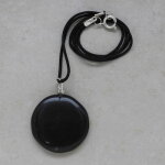 Stein: schwarzer Obsidian; Durchmesser: ca. 35 - 37 mm; Stoffband mit Karabinerverschluss
